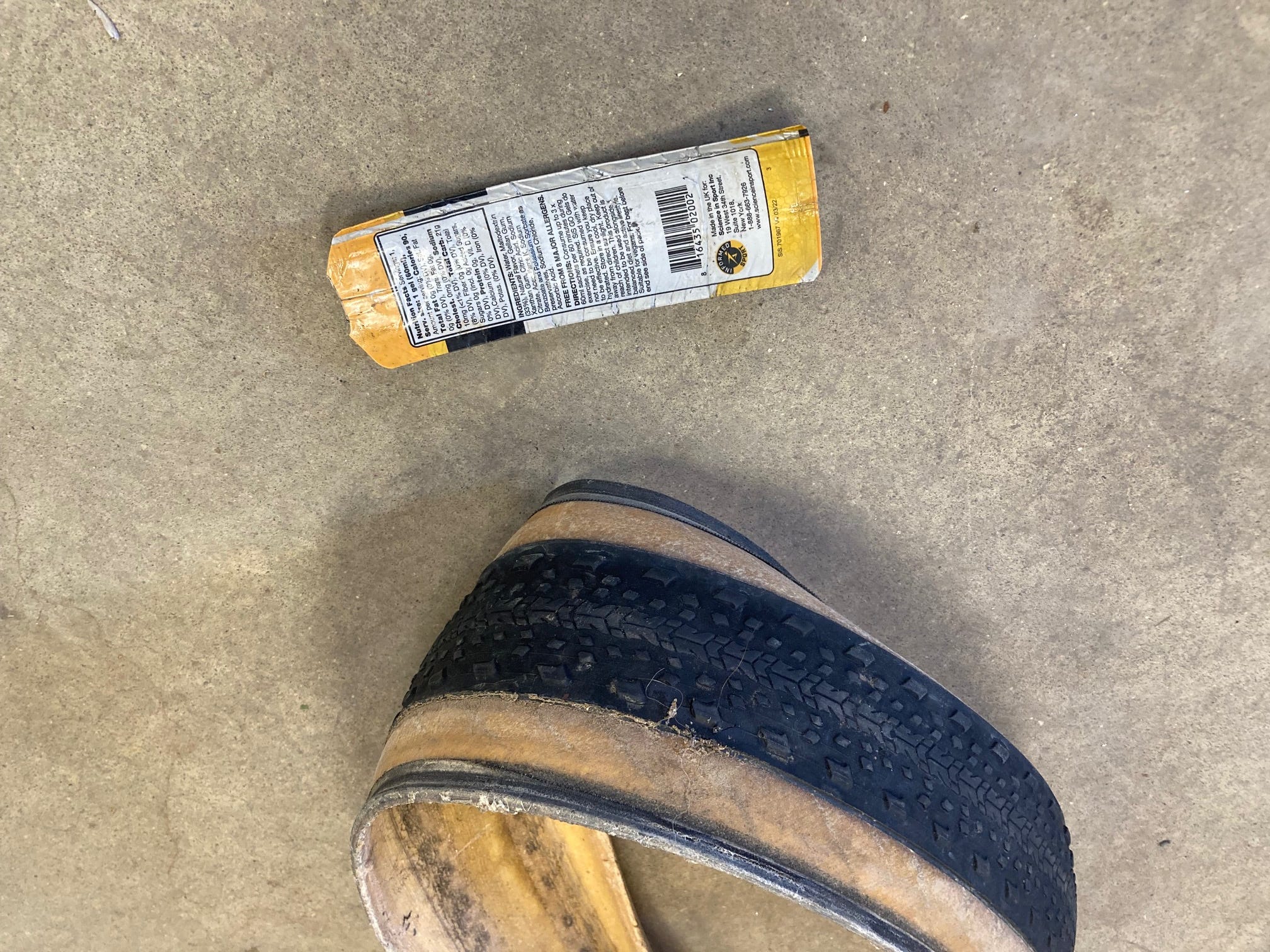 Thanks for pointing that out, and far from dating yourself, that’s still a valid fix. I forgot to mention it, but indeed, we did put in an empty energy gel package as a tire boot inside the sidewall against the hole out of which I had pulled the Stan’s Dart. Here’s that gel packet, still curved from being squished between the tube and tire.